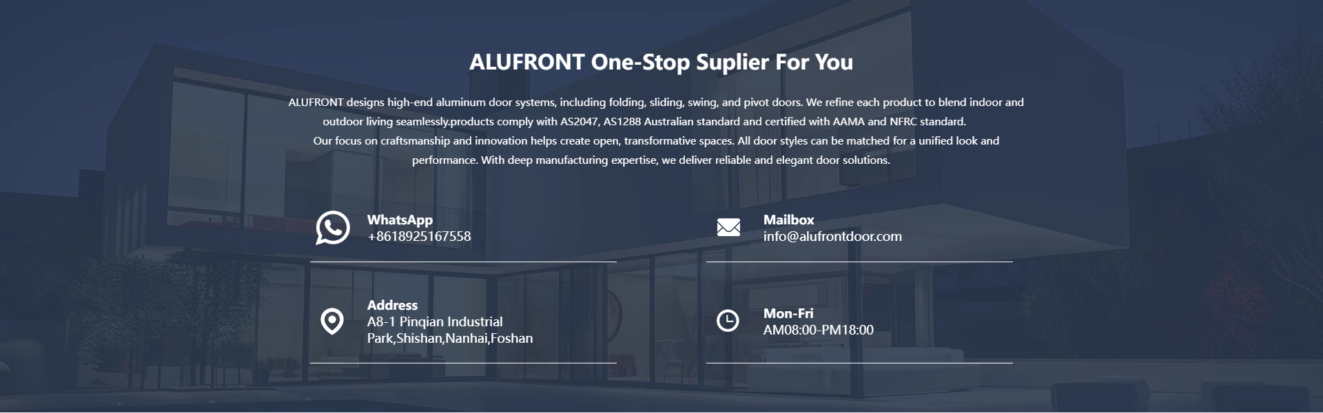 ALUFRONT designs high-end aluminum door systems, including folding, sliding, swing, and pivot doors. We refine each product to blend indoor and outdoor living seamlessly.products comply with AS2047, AS1288 Australian standard and certified with AAMA and NFRC standard.
