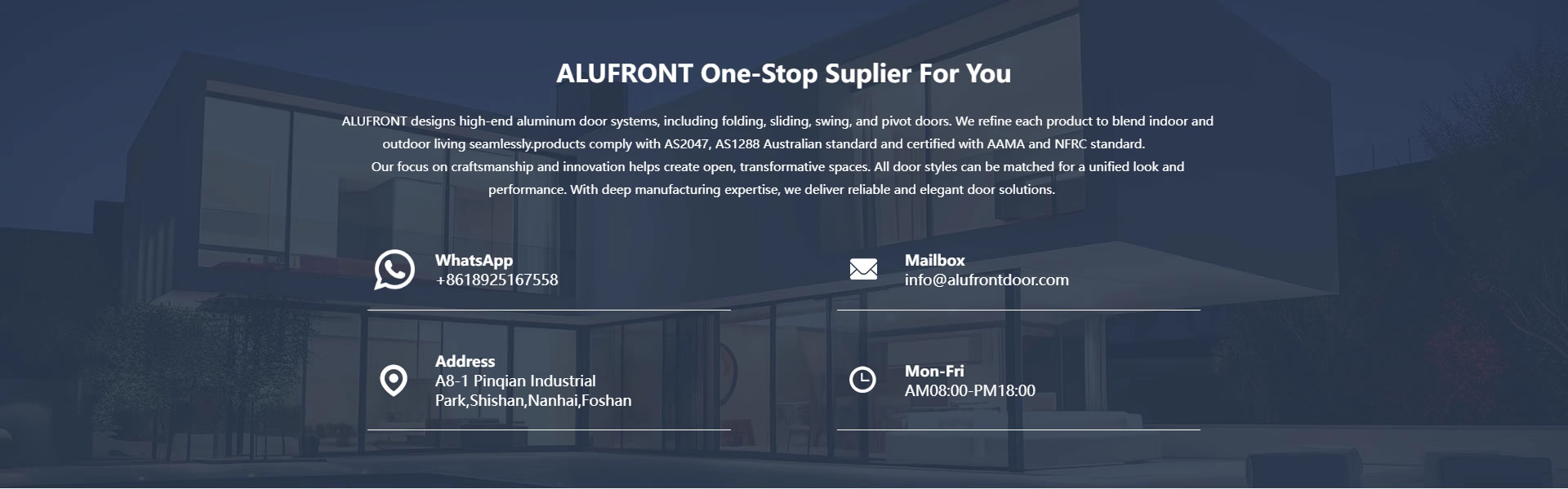 • Alufront’s products comply with the AS2047 and AS1288 standards. All glazing is toughened and meets the AS2047 and AS2088 requirements. We are a proud member of the Australian Window Association (AWA), and our products are eligible for Windows Energy Rating System (WERS) certification.